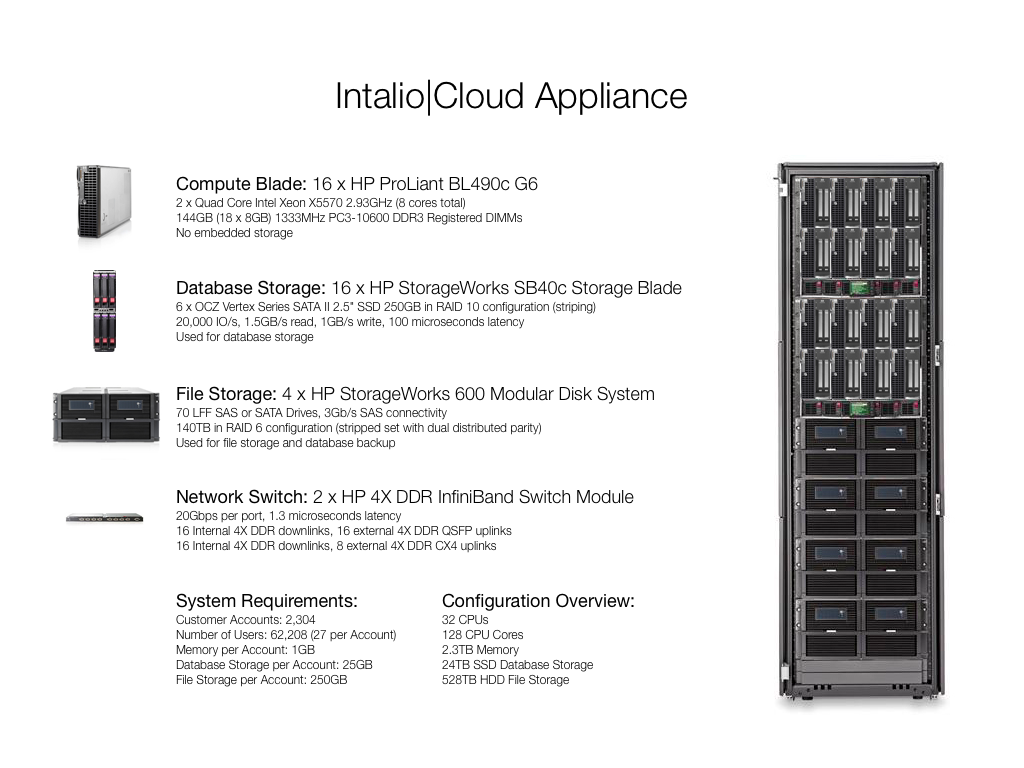In’t kort bestaat de Cloud Appliance uit een arsenaal van HP server hardware, samengezet in een rack: 32 3Ghz Quad Core Intel CPUs, 560 TB Hard disk space, 24 TB Solid State Diskspace en 2.3 TB of RAM (zie ook onderstaande figuur).