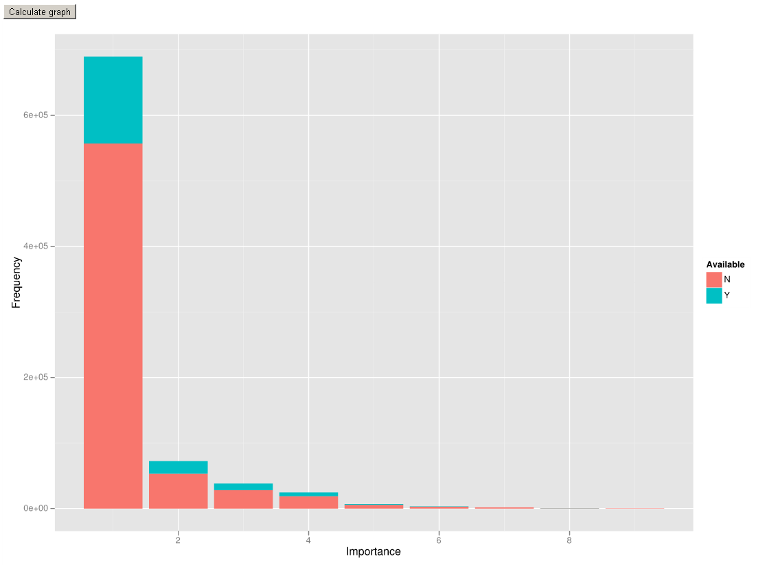 pl <- ggplot(myTable, aes(x = Importance, y = Frequency,fill=Available) ) + geom_bar(stat="identity");