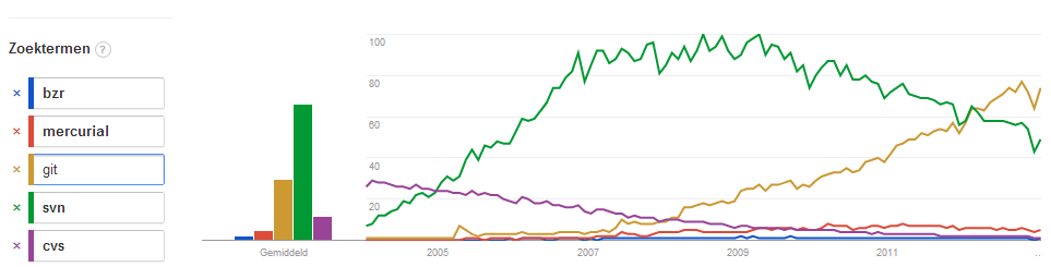 Sinds mijn vergelijkende studie een aantal jaren geleden, zijn de producten echter niet alleen geëvolueerd, maar is ook hun relatieve populariteit veranderd. In de software-ontwikkelingswereld in het algemeen merken we dat de voorkeur meer en meer naar gedistribueerde systemen zoals Git evolueert. Zelfs de grotere Application Lifecycle Management vendors ondersteunen het nu in hun producten. In onderstaande figuur zien we dat, omstreeks 2010, SVN nog steeds het populairste systeem was. Nu liggen de kaarten echter anders, en naar het einde toe zien we dat CVS zelfs onderaan de lijst bengelt. Dit wordt echter tegengesproken door de tweede figuur, waar we merken dat CVS stand houdt qua gebruik in bestaande projecten, ook al is het als zoekterm onderaan het peleton geëindigd. In de eerste figuur is Git echter duidelijk het populairste, en zelfs in de tweede figuur staat het systeem met kop en schouders boven de andere gedistribueerde systemen: Mercurial en Bazaar (bzr).
