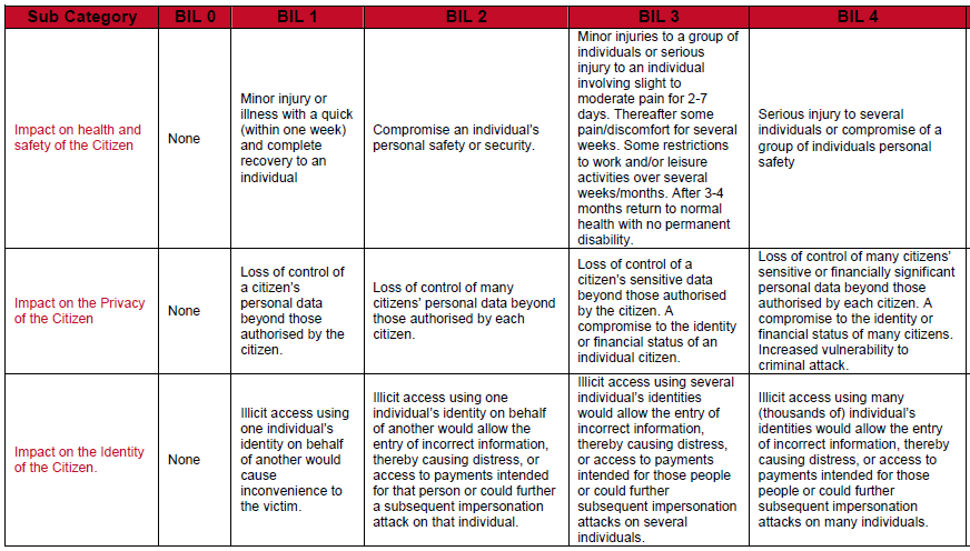 Hieronder ziet u een uittreksel uit de tabel ‘Personal / Citizen’ tot (business)impact level IL4 voor het bepalen van de impact op de burger.