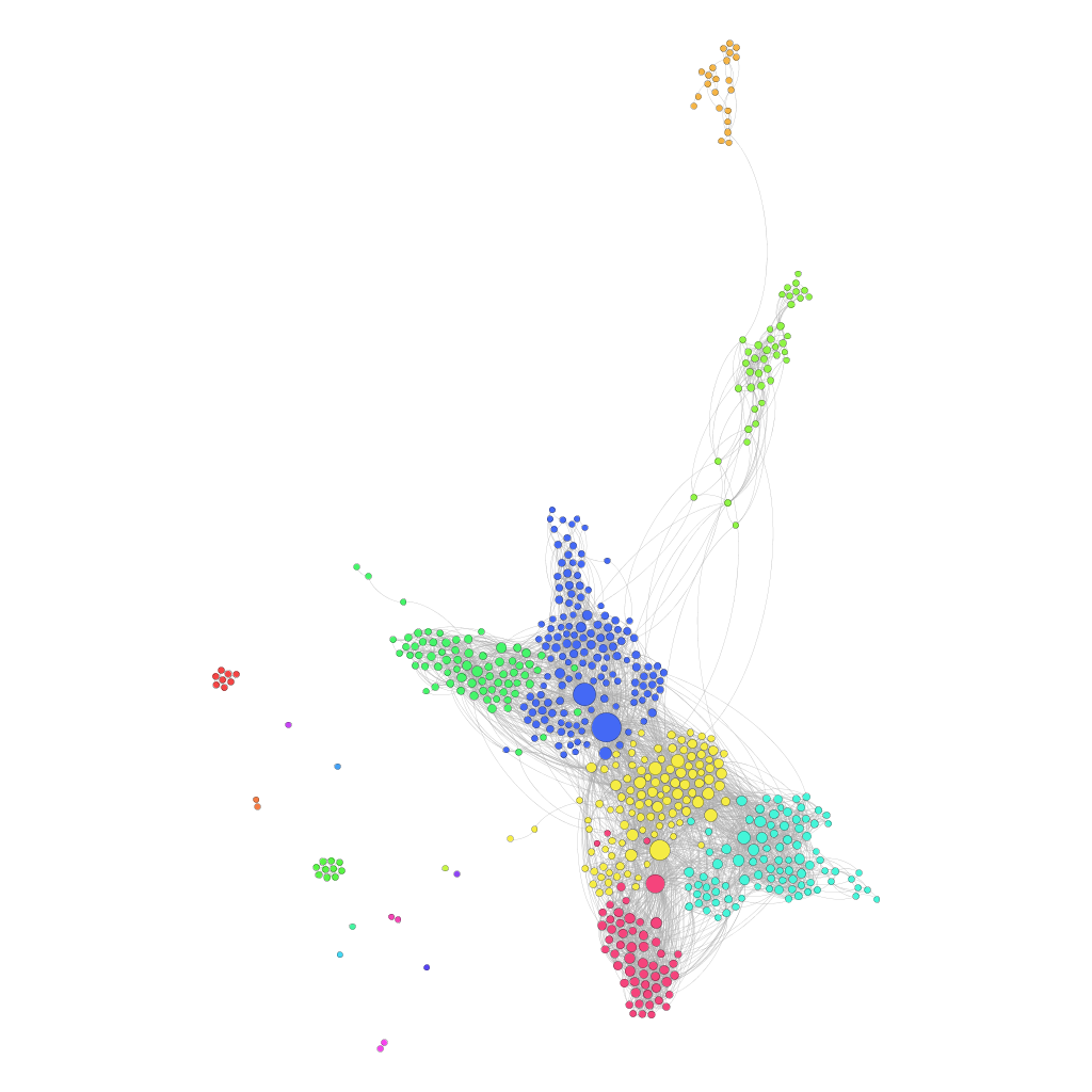 Le résultat est un petit peu meilleur, mais peu explicite. Nous allons maintenant lancer un algorithme de “modularisation”, permettant d’identifier les “clusters”, c’est-à-dire les groupes de nœuds particulièrement connectés, autrement dit gephi2les groupes d’amis ayant beaucoup de connexions entre eux. Ceci se fera en cliquant sur le bouton “Run” à côté de “Modularity” (onglet “Statistics”), puis en coloriant le graphe dans l’onglet “Partition”, sur base de “Modularity Class”. Le résultat est visible sur l’image ci-contre (cliquer pour agrandir). Pour mieux comprendre ce que l’on voit, il conviendra de faire apparaître les labels (icône avec un T, je suggère par ailleurs de choisir “Hide non-selected” dans les options d’affichage).