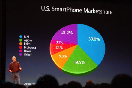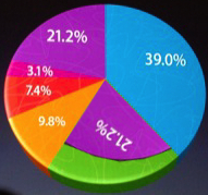 Prenons l’exemple d’un graphique en tarte : non seulement les segments qui apparaîtront du côté du lecteur seront augmentés d’une “tranche” que n’auront pas les segments opposés, mais par ailleurs la perspective diminuera la surface les segments les plus éloignés. Dans l’exemple ci-contre, on peut voir Steve Jobs, en pleine “Keynote”, présentant la répartition du marché des principaux vendeurs de smartphones. Apple (19.5 %), en vert, occupe une surface à l’écran 1.8 fois supérieure à celle occupée par le segment “Autres” (21.2 %), en violet !