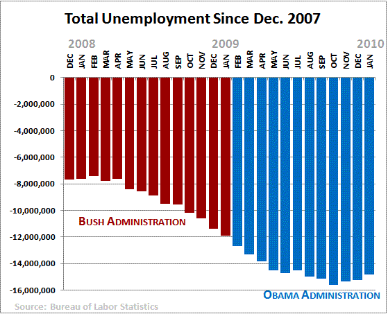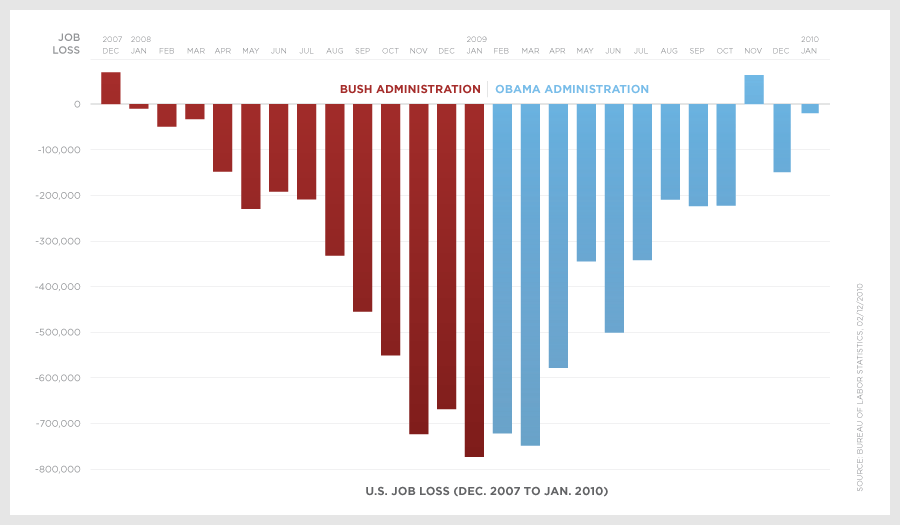 On peut d’abord remarquer trois stratagèmes simples utilisés dans ce graphique pour accentuer le point de vue de l’auteur. Le premier a déjà été présenté avec l’exemple du parti socialiste français ci-dessus, et consiste à “retourner” le diagramme en bâton. On a donc quelque chose en décroissance sous l’administration Bush, qui accentue l’aspect dramatique, et en croissance sous celle d’Obama, pour accentuer le sentiment de progrès et de rétablissement. Par ailleurs, on voit un bleu clair, lumineux, pour la partie d’Obama et un rouge foncé, sombre pour celle de Bush. Ce n’est certainement pas innocent. Enfin, la légende indique le graphique va de 2007 à 2010. Si l’on ne fait pas attention aux mois, on pourrait penser que le graphique couvre 3, voire 4 ans, et qu’il s’agit donc d’une progression durable. Or le graphique concerne essentiellement 2008 et 2009 (décembre 2007-janvier 2010), soit à peine plus de deux ans.