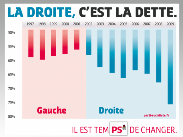 Il met en avant une épouvantable évolution de la dette lorsque la droite s’est trouvée au pouvoir entre 2002 et 2009. Première chose intéressante à constater : alors qu’en général on représente la base d’un diagramme en bâtons en bas, les “communicants” du PS ont choisi ici de l’inverser. On observe donc une “montée” (quelque chose d’intuitivement positif) pour la gauche, et une “baisse” pour la droite (intuitivement négative).