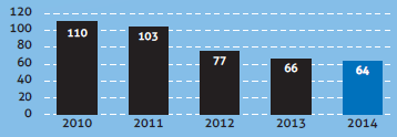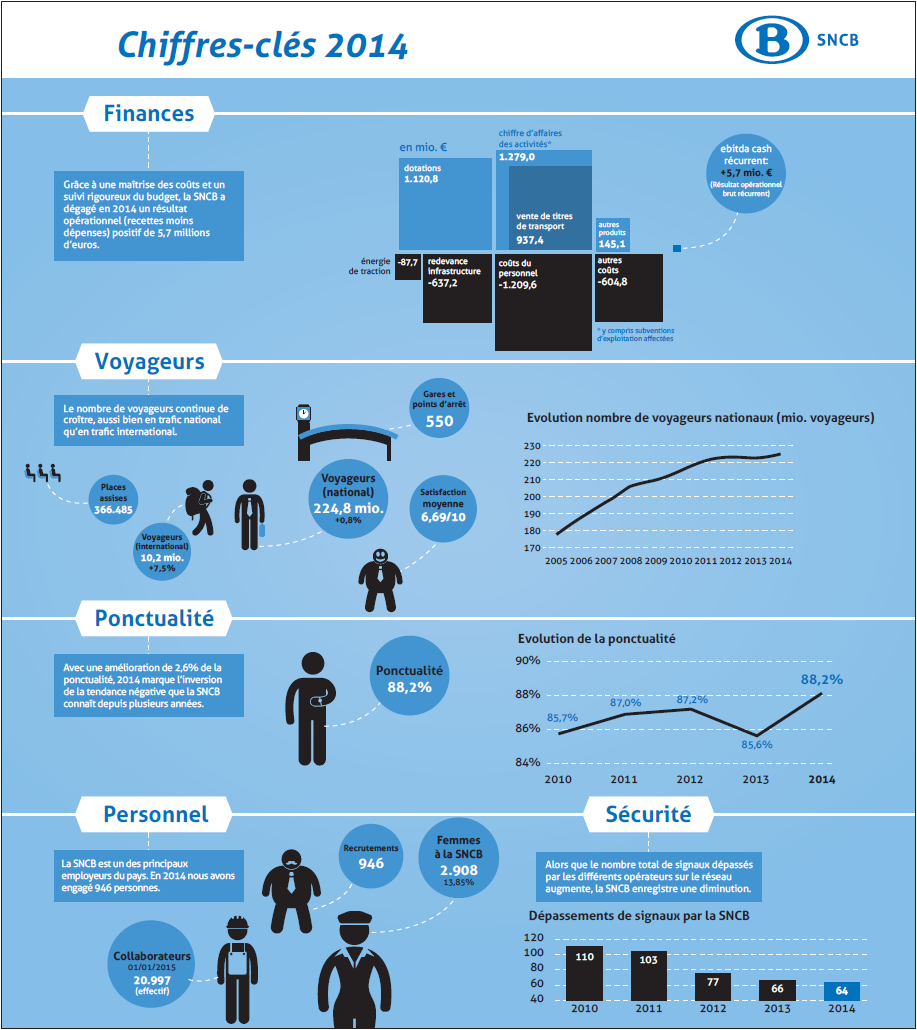 Prenons par exemple l’illustration ci-contre, issue d’une infographie de la SNCB, parue dans le journal Métro du mercredi 10 juin 2015. On y montre la baisse du nombre de dépassements de signaux entre 2010 et 2014. Ils sont passés de 110 à 64, soit une baisse de 41.8 % ((110-64)/110). Par contre, visuellement, grâce au/à cause du fait que l’axe vertical démarre à 40 et non en zéro, la baisse est de 70 (110-40) à 24, soit 65.7 %. Notre cerveau enregistre une baisse drastique de quasiment un facteur 3. On a donc un lie factor de 65.7/41.8, soit 1.54. L’effet visuel est dès lors 54% plus important que les données à représenter 2.