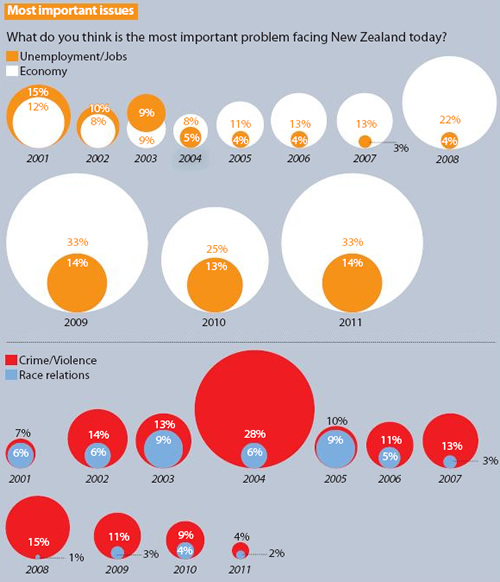Lorsque l’on mélange ces deux sources de confusions, on arrive à une infographie telle que celle présentée dans le “Sunday Star Times” du 12 février 2012 (reprise sur www.statschart.org.nz). Outre le fait qu’il existe des façons plus adaptées de représenter l’évolution de deux mesures dans le temps, on voit par exemple que le petit cercle orange de 2009 (14 %) a une surface 5.5 plus petite que le cercle dans lequel il est inscrit (33 %), soit une augmentation de surface de 450%, pour représenter en réalité une augmentation de 135% (14% -> 33%). Cela nous donne donc un lie factor de 3.32. Étant la relation quadratique entre diamètre et surface d’un cercle, le lie factor sera en fait différent pour chacun des graphiques (et d’autant plus important que le ratio dans les données est important). Le fait qu’un cercle soit placé devant l’autre est également trompeur : dans le premier item de la seconde infographie, la partie rouge est à peine visible, alors qu’elle représente une quantité supérieure à la partie bleue.