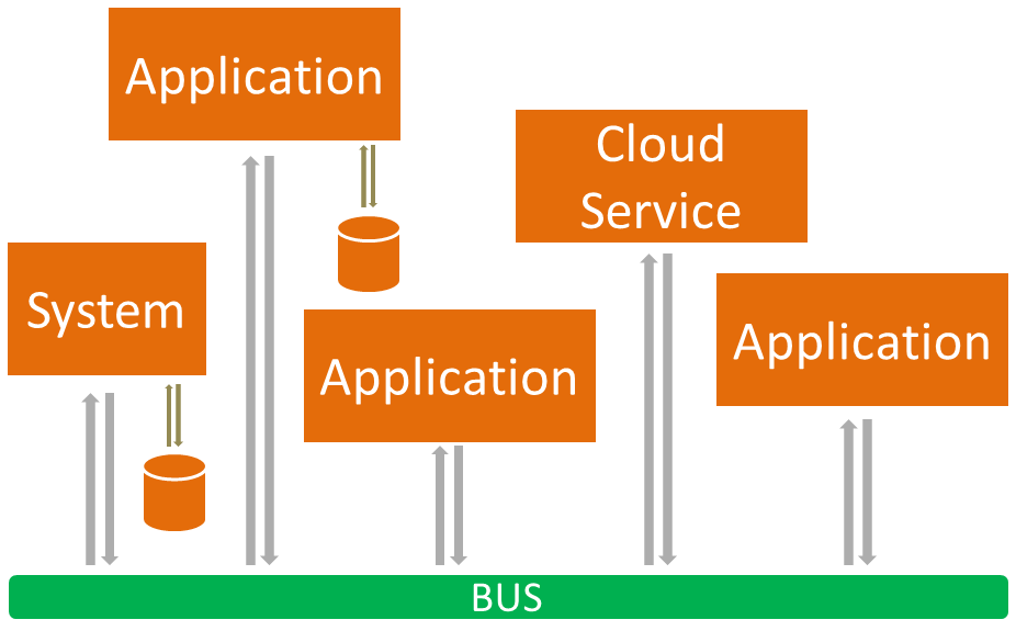 Binnen een Event Driven Architecture (EDA), hebben we ook publish/subscribe, maar dan op een veel grotere schaal. Meestal gaat het nu om communicatie tussen verschillende applicaties en systemen op een zo robuust mogelijke manier. Het Event systeem zal nu worden geïmplementeerd a.d.h.v. een BUS systeem, en we zullen het de Event Bus noemen.