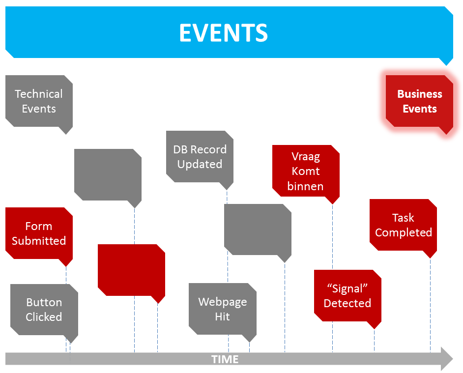 Heel veel zaken binnen een softwaresysteem kunnen worden gemodelleerd als een gebeurtenis, of Event: het aanklikken van een knop, het indrukken van een toets, het verbinden met een server, enz. Een bijzonder interessante vorm van gebeurtenissen zijn daarbij degene die ook op business niveau een betekenis hebben: het inloggen van een gebruiker, het versturen van een aanvraagformulier, het aanmaken van een nieuw record met gegevens, of zelfs het beschikbaar worden van een signaal komende uit een big data analytics platform.