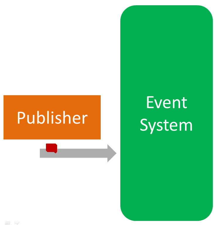 Het mechanisme speelt zich af tussen drie partijen: de publisher (die een Event kan “publiceren”), de subscriber (die zich voor een event kan “onderschrijven”), en het Event systeem. Deze partijen kunnen verschillende vormen aannemen (van één welbepaald object binnen een applicatie, over subsystemen heen, tot verschillende en volledig op zichzelf staande applicaties of IT-systemen). Van publishers en subscribers kunnen er meerdere zijn. Van het Event systeem is er, althans wat de interacties rond minstens één welbepaalde soort Events betreft, slechts één.