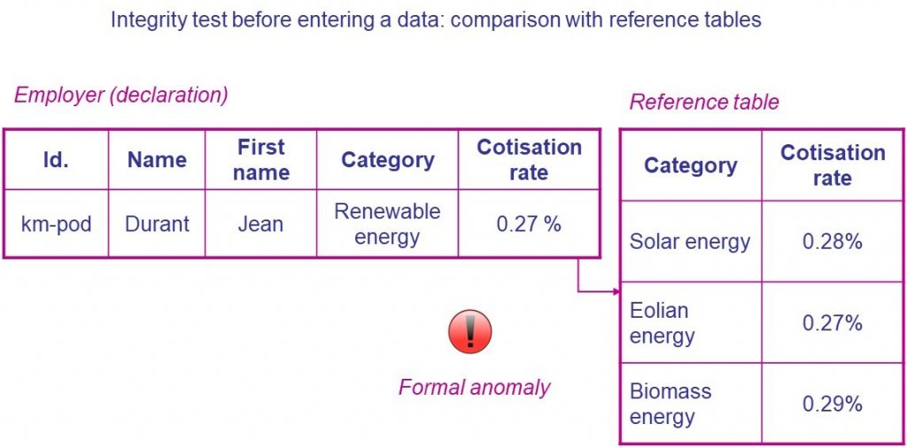 Dans ce cas, il est impossible de vérifier la correction des valeurs de la base de données de manière automatique. En effet, lorsqu’une incohérence apparaît entre une valeur saisie au sein de la base et les tables de référence permettant d’en tester la validité, il peut s’avérer indispensable, selon les enjeux, de procéder à une vérification manuelle, en contactant le citoyen ou l’entreprise concernée, par exemple.