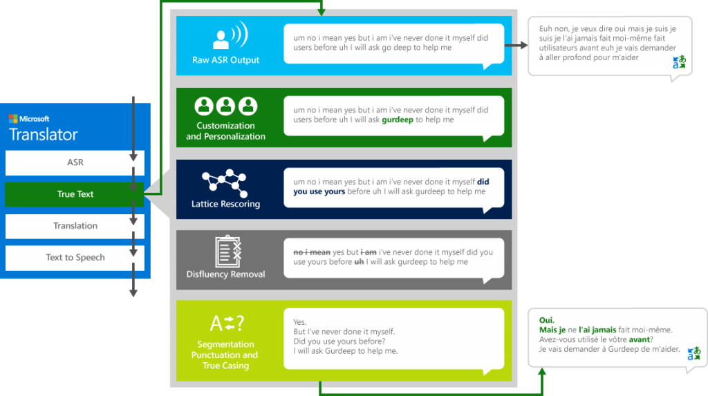 Bij elke automatische transcriptie van audio, of bij ondertiteling, zijn ook segmentatie en filtering (bvb het weglaten van “euh” en andere stopwoorden) belangrijke problemen die in een editing-fase opgelost moeten geraken – zoals duidelijk te merken in deze demonstratie van BBC R&D. Ook getwijfel, herhalingen, e.a. zijn erg courant in natuurlijke spraak maar wil je niet terugzien in een transcriptie of een daaropvolgende vertaling. Misschien wil je ook bepaalde entiteiten zoals eigennamen of datums correct herkennen. Microsoft vatte dat alles samen in het volgende diagram van een speech-to-speech vertaalsysteem: