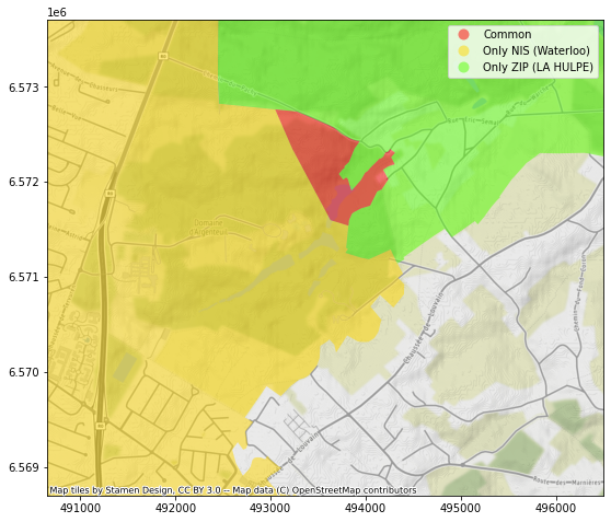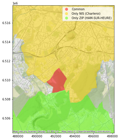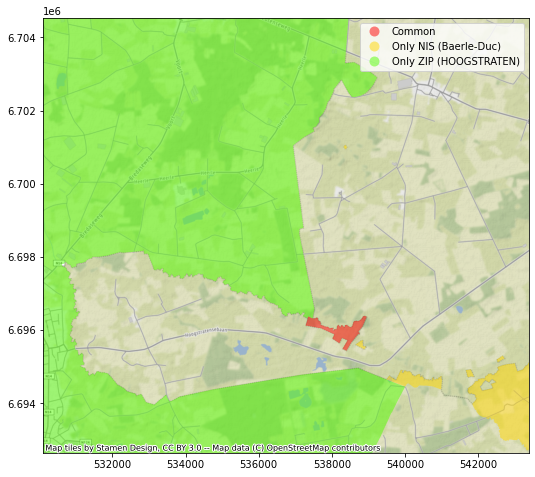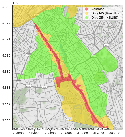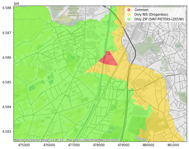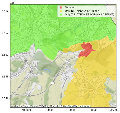 Avec la jointure spatiale, nous allons pouvoir, sur base d’un dataset contenant les frontières des communes postales et un autre contenant les frontières des communes statistiques, réaliser 3 opérations :
