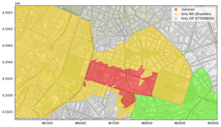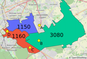Par exemple, à Bruxelles, tout le quartier autour de “Schuman” et “Maelbeek” fait partie de la commune d’Etterbeek selon les données postales, alors qu’il fait partie de la commune de Bruxelles-ville selon les données statistiques. Google maps et OpenStreetMap sont du même avis que les données statistiques, alors que Here et Bing se rangent du côté des données postales ! Dans la pratique, les plaques de rue visibles sur StreetView semblent contredire les données postales.