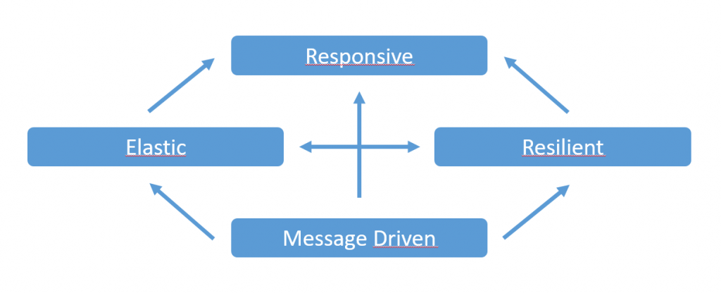 Aan de grondslag van Reactive ligt het feit dat het “message driven” is (Zie Fig. 1). Men zal een systeem bouwen aan de hand van een aantal met elkaar communicerende subsystemen die berichten zullen uitwisselen. Dit kan zowel rechtstreeks als via het publish/subscribe mechanisme van Events. Deze communicatie is altijd inherent asynchroon. Men weet niet wanneer er op een bericht zal worden gereageerd en men gaat er ook niet expliciet op wachten. Deze vorm van communicatie tussen componenten zorgt ervoor dat ze losjes gekoppeld zijn en locatietransparant. Dit “message driven” fundament leidt verder tot verschillende voordelen.