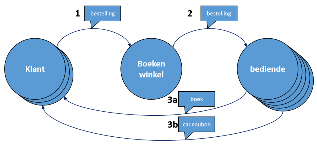 In onderstaande figuur zie je een tekening van een aantal actoren in een boekenwinkel systeem en de berichten die ze elkaar sturen: er zijn klanten, de boekenwinkel zelf, en bedienden (die boeken opsturen). Het systeem zal als volgt werken: klanten sturen bestellingen naar de winkel; deze zal de bestellingen verder doorgeven aan een bediende. Deze hebben wat tijd nodig om een bestelling af te handelen, dus er zijn er meerdere, om meer bestellingen aan te kunnen. Hoe de winkel kiest welke taak aan welke bediende te geven, zouden we op verschillende manieren kunnen oplossen (b.v. “neem een willekeurige vrije bediende”), maar zoveel detail laten we hier niet zien.