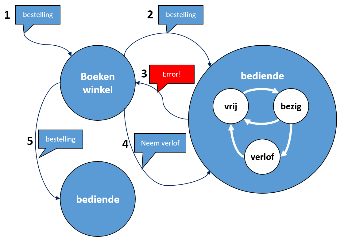 De bediende die een bestelling krijgt wordt “bezig” (een andere toestand dan “vrij”) en zal uiteindelijk een boek terugsturen naar de klant (in het geval van het IT systeem dat dit systeem modelleert, kan dit b.v. een bericht zijn met de tracking code van het pakket). Daarna wordt de bediende terug “vrij”.