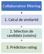 - Des utilisateurs similaires expriment des préférences similaires et donnent des notes similaires (approche user-based). On prédit la préférence d’un utilisateur A pour un item X sur base des ratings donnés dans le passé par des utilisateurs ayant les mêmes intérêts que A à l’item X.