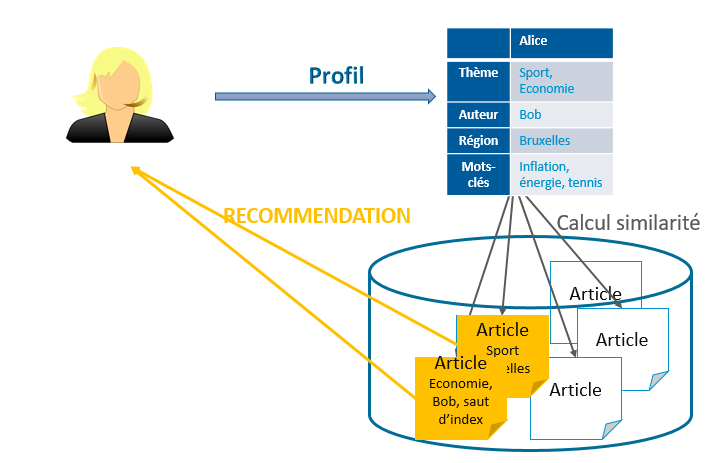 Pour chaque utilisateur on définit un profil qui exprime les préférences de l’utilisateur. La méthode la plus simple est de construire le profil à partir d’attributs semblables à ceux des items. Le profil utilisateur est alors comparé aux attributs des items et les items les plus similaires sont recommandés à l’utilisateur. Pour faire le match entre le profil utilisateur et les items, on utilise des mesures de similarité telles que la similarité cosinus.