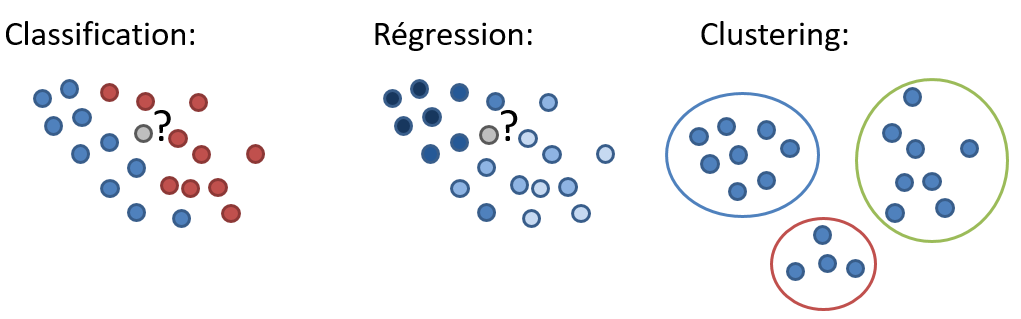Il existe aussi une famille de méthodes non-supervisées, lorsqu’on ne fournit pas de label. On parle principalement de “clustering“, le but étant d’arriver à déterminer automatique des groupes de clients (dans notre cas) ayant des caractéristiques similaires.