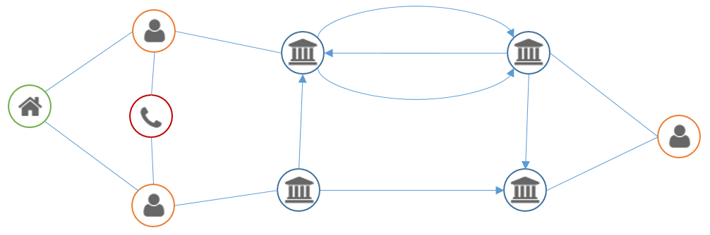 Dans ce blog (voir par exemple ici ou ici), nous avons souvent montré la puissance de l’analyse réseau, qui consiste à ne plus considérer les données comme des individus ayant chacun un certain nombre de caractéristiques, mais comme des entités liées entre elles par des relations. Dans notre cas, on pourrait considérer un modèle simple avec des comptes bancaires et des personnes, les relations entre comptes bancaires représentant les transactions, et celles entre personnes et comptes, l’appartenance. On peut facilement ensuite enrichir le modèle avec les domiciles des personnes et les numéros de téléphones, comme illustré ci-dessous.