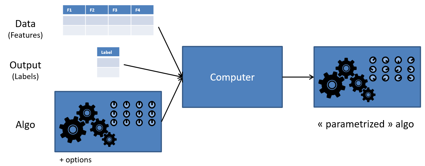 Définir un tel arbre peut être complexe, et parfois arbitraire, mais relèverait de la “programmation (informatique) traditionnelle” : on fournit à un ordinateur un programme (l’arbre de décision avec toutes ses branches, ses conditions et ses seuils) et des données (le montant du crédit demandé, le salaire, les avoirs, le montant des autres crédits en cours…), et il fournira un “output” (accorder ou non le crédit).