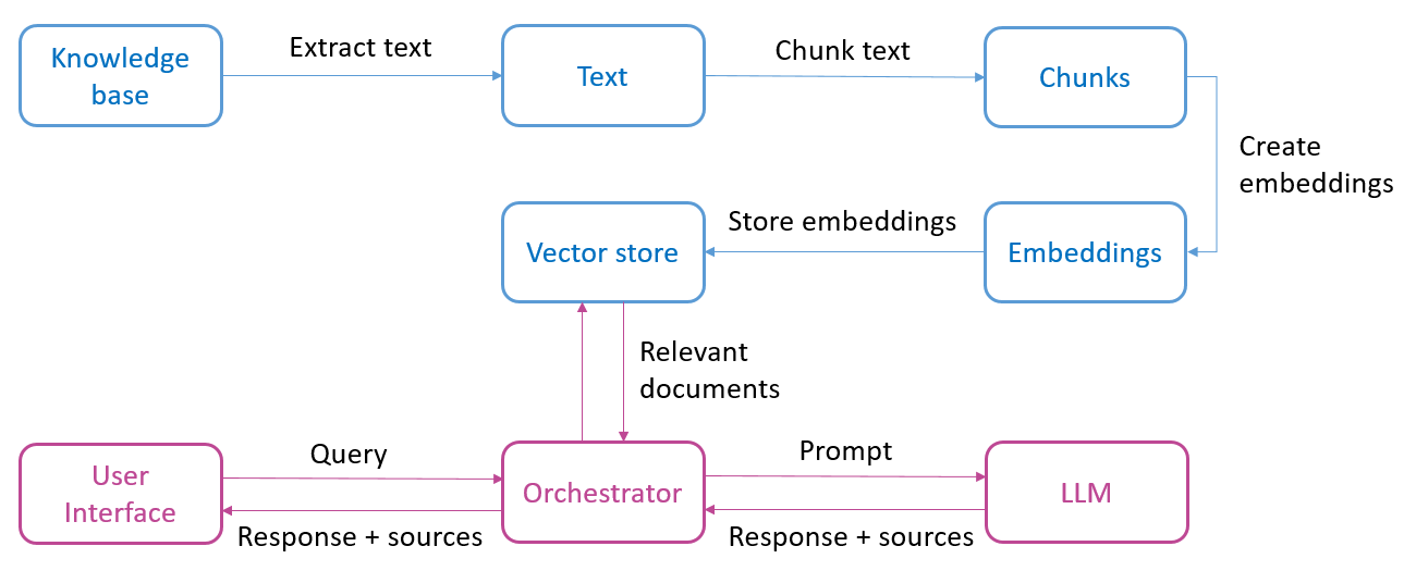 Onderstaand schema geeft in grote lijnen weer welke componenten onderdeel uitmaken van een question answering systeem op basis van taalmodellen. Het bovenste gedeelte (blauw) zijn alle stappen die nodig zijn om de content klaar te zetten: