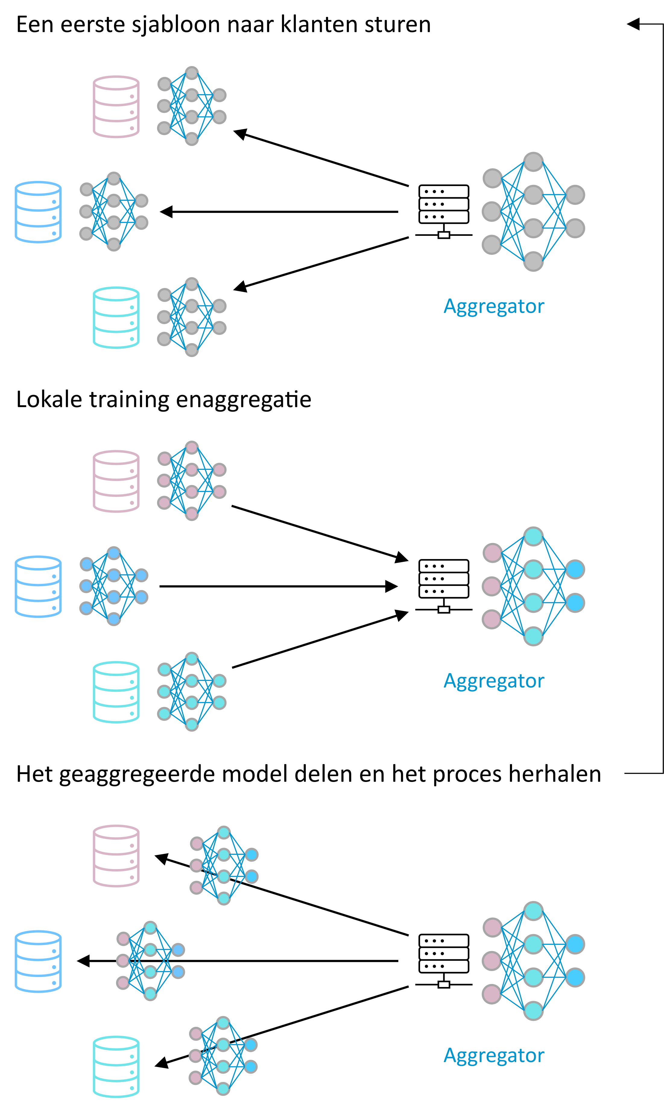 Geïntroduceerd door McMahan et al. [17], is federated learning een gedistribueerde en collaboratieve manier van machinaal leren. De machines die betrokken zijn bij het leren zijn niet verplicht om hun gegevens te delen en sturen slechts modellen die geleerd zijn van hun gegevens om bij te dragen aan een globaal model dat het resultaat is van het combineren van alle lokale modellen9.