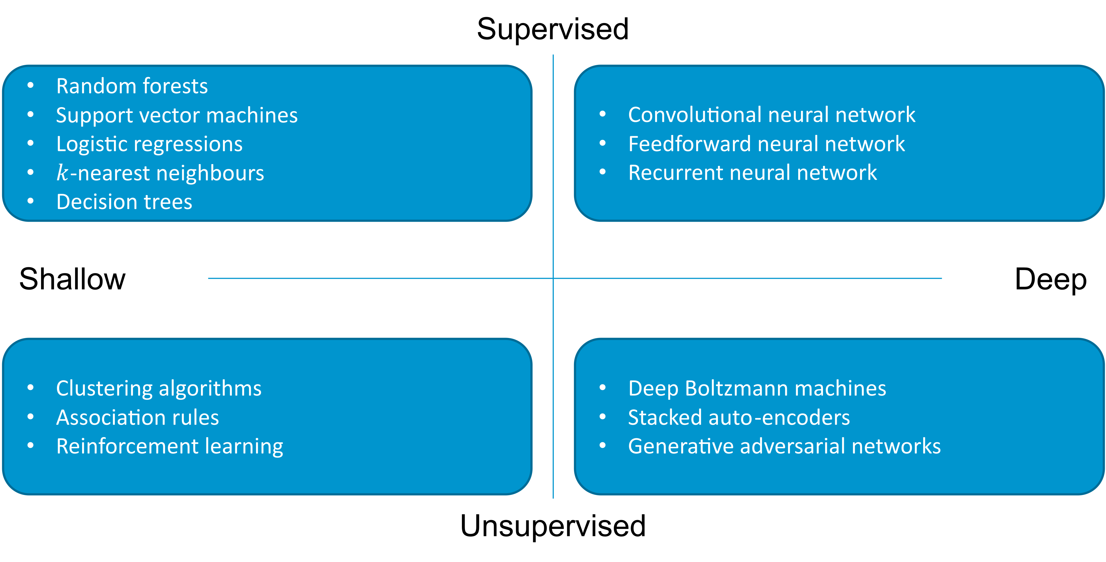In de afgelopen tien jaar heeft machine learning aanzienlijke vooruitgang geboekt op een aantal verschillende gebieden, te beginnen met zogenaamde supervised modellen (de machine krijgt de klasse elementen die hij moet leren, bijvoorbeeld of een bepaalde transactie frauduleus of onschuldig is), dan unsupervised (de machine moet zelf de verschillende klassen ontdekken op basis van de gegevens), dan reinforcement learning (de machine krijgt een vorm van beloning als hij informatie correct classificeert). Figuur 1 toont de belangrijkste algoritmen voor machinaal leren die worden gebruikt in cyberbeveiliging.