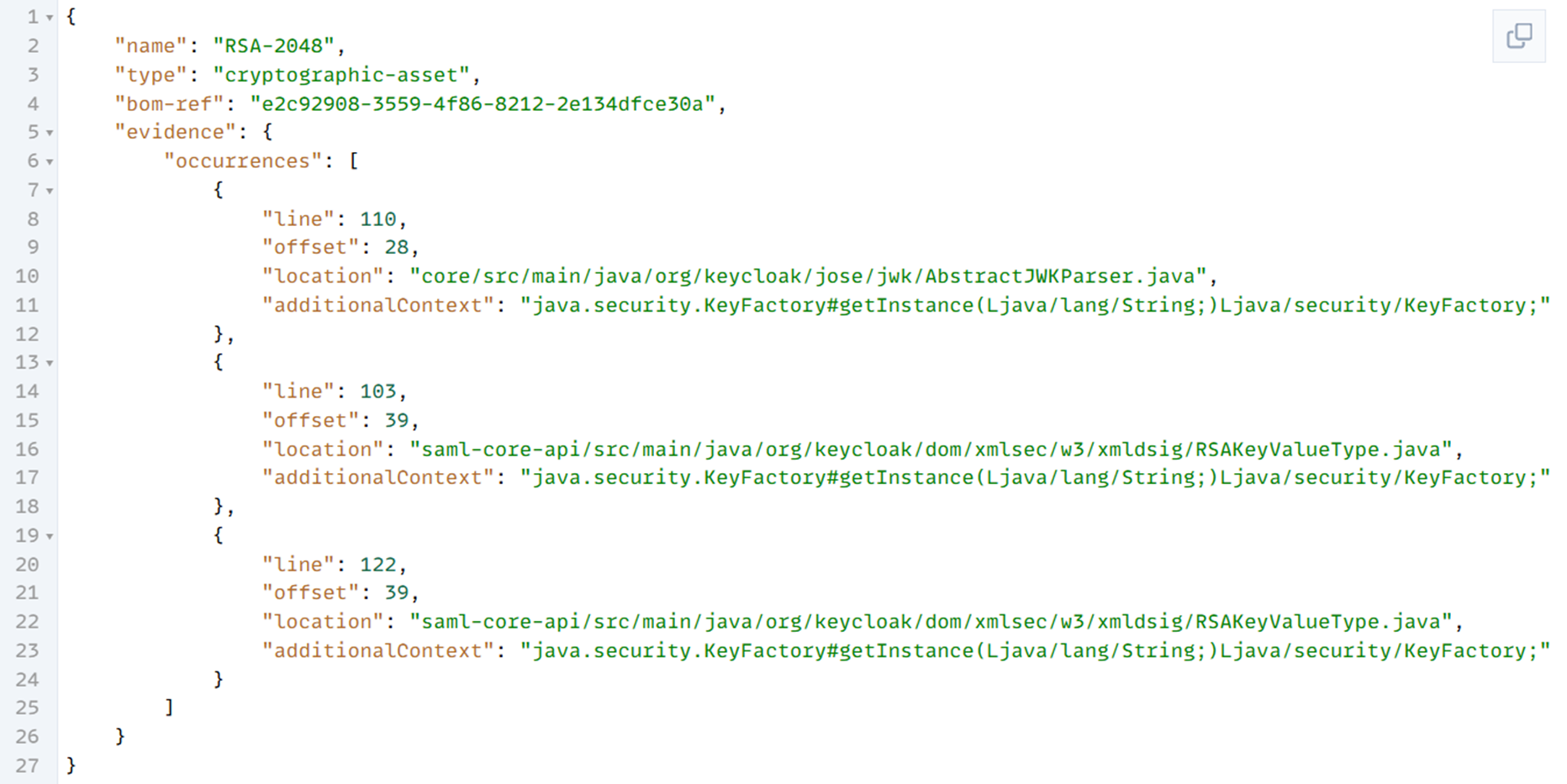 The illustration below is a CBOM fragment that shows where RSA-2048 is used in the scanned source code of an application.