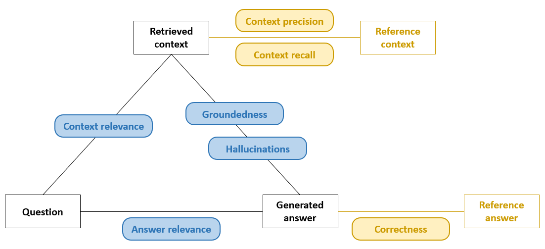 In de ontwikkelfase beschikken we vaak over referentie-antwoorden; daardoor kunnen we een correctness evaluator inzetten die simpelweg meet in hoeverre het gegenereerde antwoord overeenkomt met het referentie-antwoord. Aanvullende metrieken kunnen zicht bieden op andere RAG-aspecten, zoals context precision, die meet welk deel van de aangeleverde chunks relevant zijn, en context recall, die meet hoeveel van de relevante chunks werden aangeleverd. In de figuur hieronder zijn deze referentie-gebaseerde metrieken aangeduid in geel.