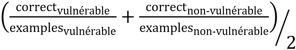 1 Les auteurs préfèrent le score de précision équilibrée (« balanced accuracy ») au score classique F1 afin de mieux prémunir des biais potentiels du modèle évalué. Il est défini comme :