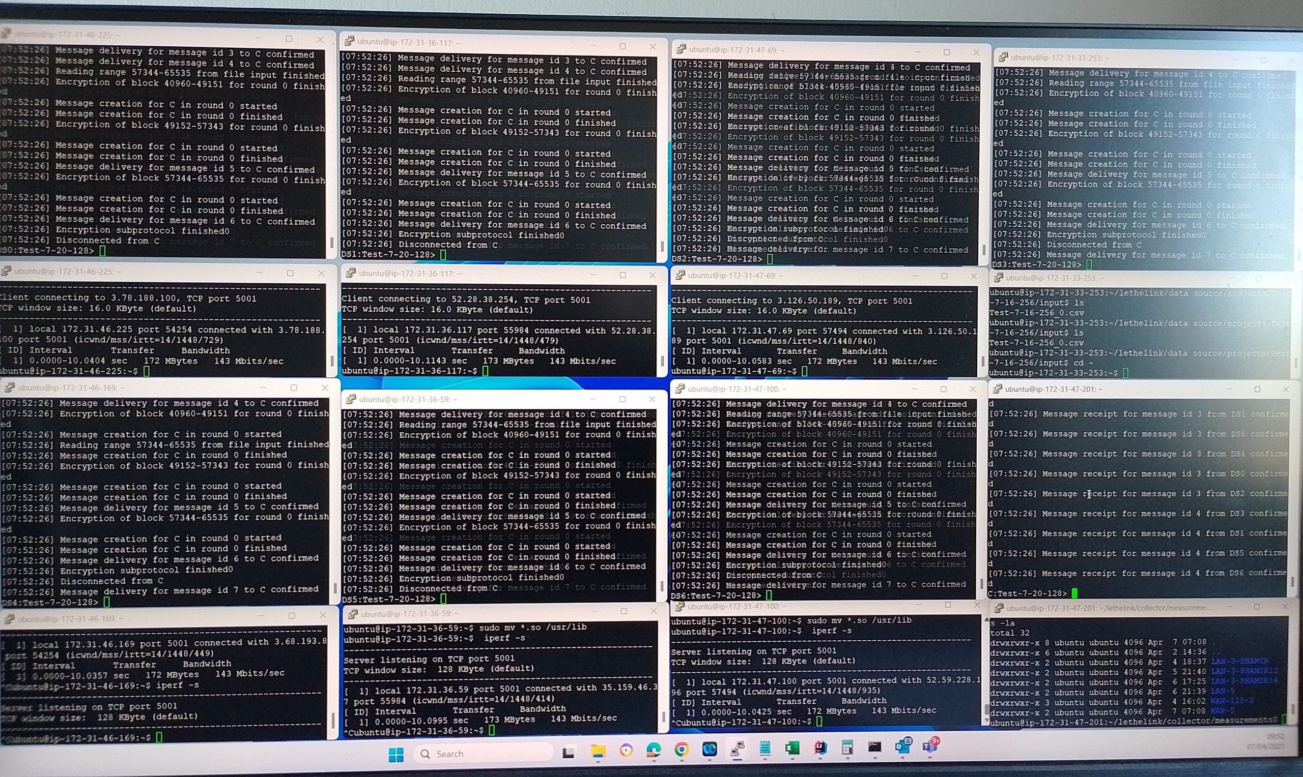 Maintenant que nous savons comment interpréter ce tableau, nous constatons par exemple qu’il faut 25 secondes pour exécuter le protocole lorsque trois sources de données fournissent chacune 1 million (220) d’enregistrements sur un WAN. La quantité de données fournies a également un impact sur le temps d’exécution, mais pour cela, nous vous renvoyons au tableau 3 de notre publication commune. En résumé, tant le protocole que sa mise en œuvre sont particulièrement efficaces. Pour conclure, l’illustration 4 donne une idée générale de la réalisation des tests.