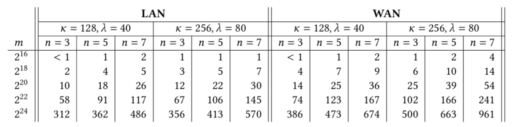 • La variable n représente le nombre de détenteurs de données. Nous avons effectué des tests avec 3, 5 et 7 détenteurs de données, mais il n’y a aucune limitation technique pour un nombre beaucoup plus important.