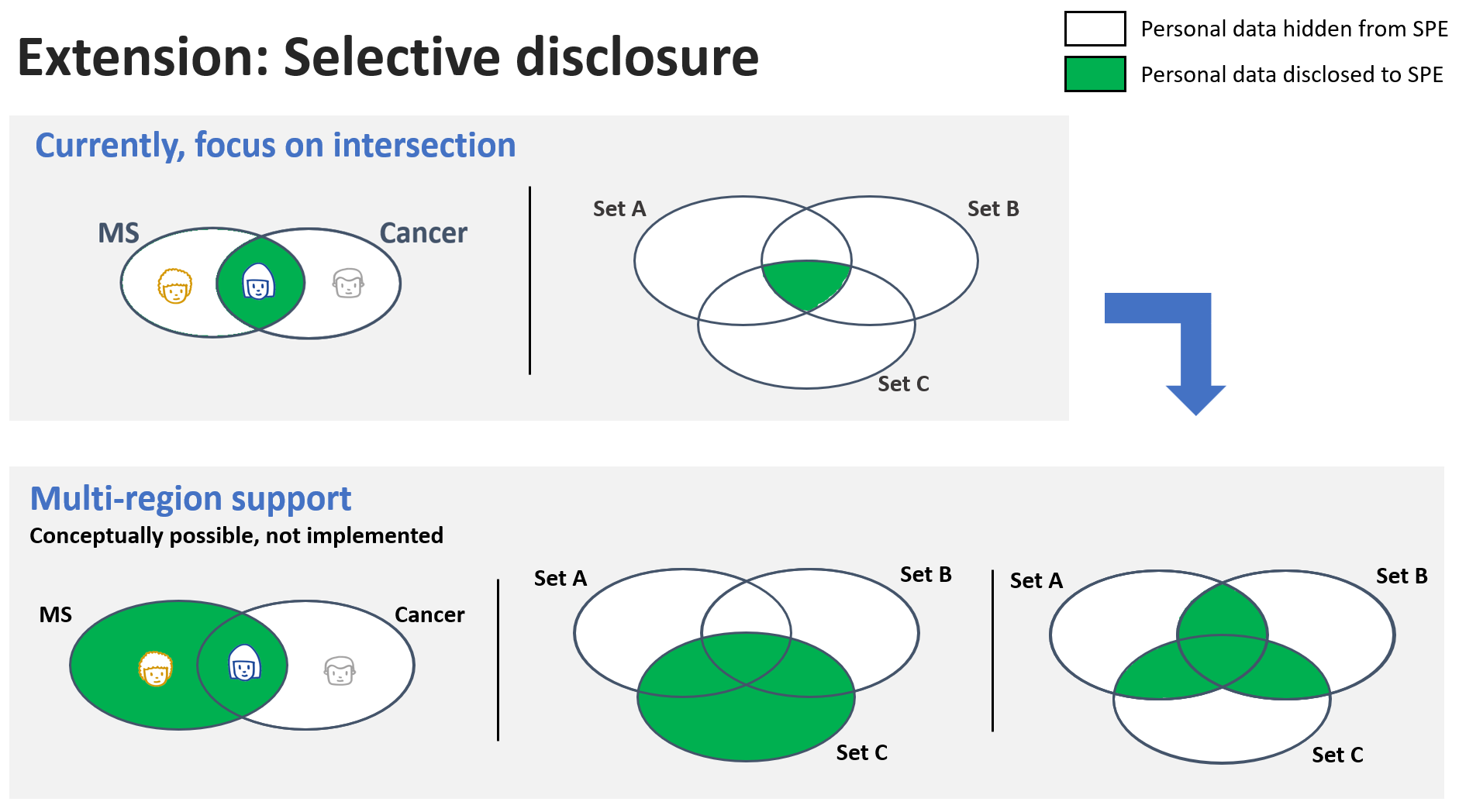 • Divulgation sélective. Actuellement, le prototype se concentre sur des moyennes ; ce n’est que si tous les détenteurs de données fournissent des enregistrements sur un même citoyen que l’enregistrement composite devient visible pour le collecteur de données. Dans la pratique, une plus grande flexibilité est requise, comme l’indique l’illustration 5. Dans le cas d’utilisation présenté en introduction de cet article, le chercheur avait besoin de données pseudonymisées sur tous les patients atteints de SEP, alors que notre prototype ne fournit actuellement que des données pseudonymisées sur tous les patients atteints de SEP ayant également reçu un diagnostic de cancer.