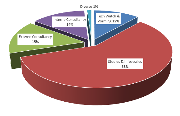 In 2025 namen de consultancyactiviteiten 29% van onze tijd in beslag. Circa 58% werd gespendeerd aan onderzoeksprojecten en 12% aan technology watch en permanente vorming.